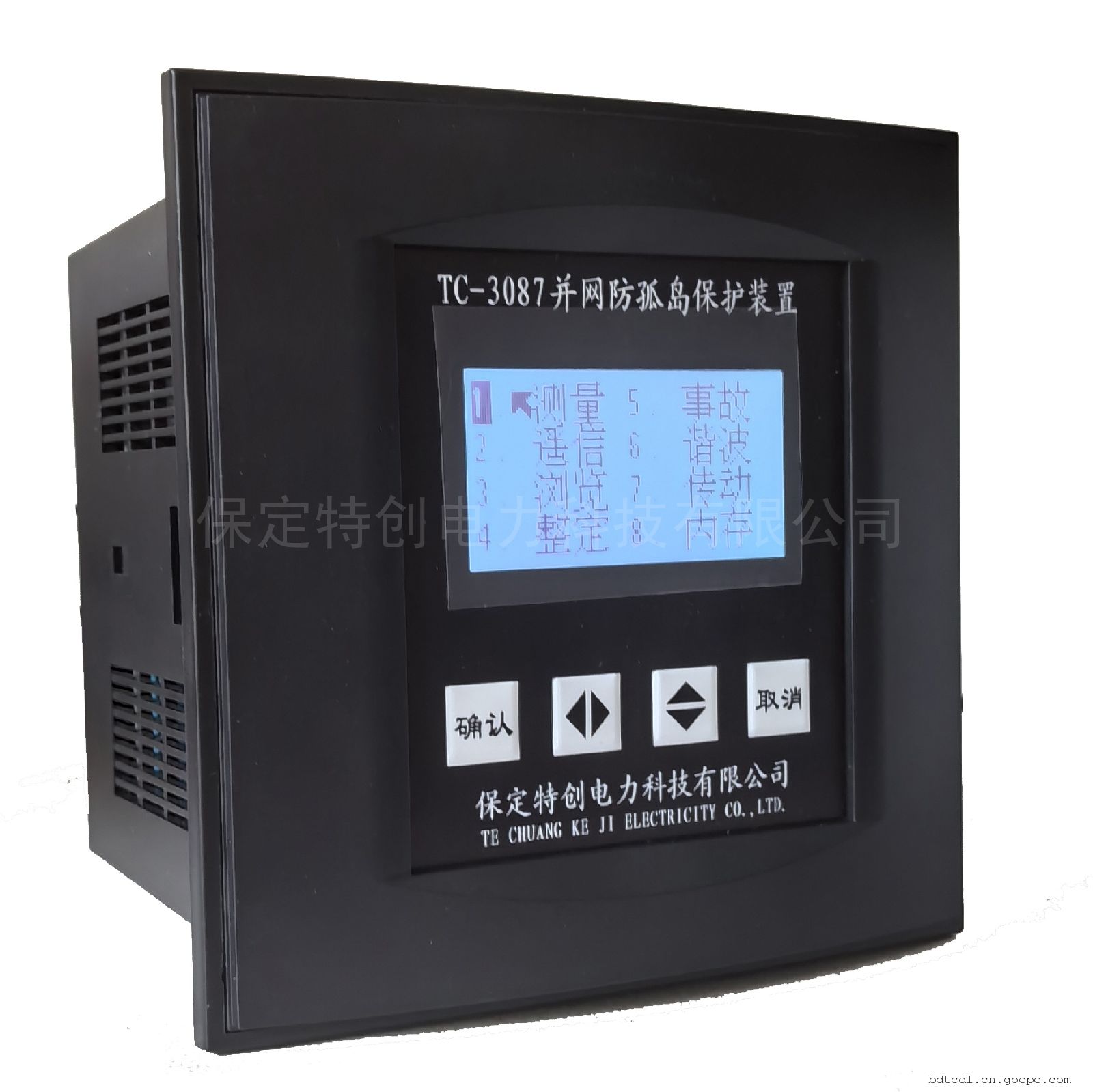 光伏并网反孤岛保护装置TC-3087的任务是对配电变压器的低压侧进行实时监测;对清洁电源进行必要的控制。采用专门为其设计的微机装置和控制电路,这样可以孤岛保证保护动作快速性和控制的准确性。
